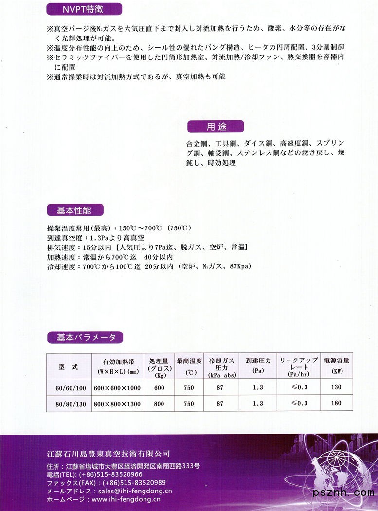 江蘇石川島豐東真空技術有限公司 真空回火爐NVPT系列 真空滲碳爐VCB系列 真空脫脂清洗機HWBV系列點擊:494 查看原圖![]() ![]() ![]() 江蘇石川島豐東真空技術有限公司