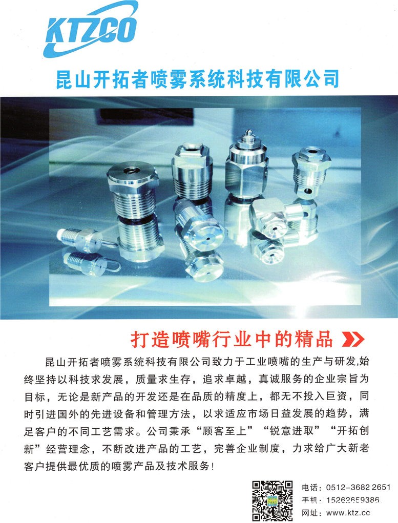 | 公司簡(jiǎn)介: | 昆山開拓者噴霧系統(tǒng)科技有限公司 十多年來全心致力于工業(yè)噴嘴的研究與生產(chǎn),無論是在新產(chǎn)品的開發(fā),還是在品質(zhì)的精度上,都不遺余力地投下巨額資金及人力,雖然現(xiàn)今產(chǎn)品種類多達(dá)20000種以上,但是我們依然秉持著創(chuàng)新及服務(wù)的精神,持續(xù)以高科技的流體力學(xué)技術(shù),研發(fā)最先進(jìn)的噴霧產(chǎn)品,協(xié)助產(chǎn)業(yè)升級(jí)改善制程能力。 ![]() 噴嘴看似簡(jiǎn)單,實(shí)際上是流體力學(xué)的高度專業(yè)應(yīng)用,絕非一般的機(jī)械加工可以取代的,噴嘴必須經(jīng)過專業(yè)的設(shè)計(jì),精良的加工,以及高精密儀器的測(cè)試才能達(dá)到最理想的噴霧效果,在眾多領(lǐng)域中,噴嘴扮演著重要角色。 由于越來越激烈的市場(chǎng)競(jìng)爭(zhēng),客戶對(duì)產(chǎn)品的性價(jià)比也提出了更高的要求,促使生產(chǎn)廠家不斷改善產(chǎn)品生產(chǎn)工藝,開拓者噴嘴技術(shù)可以幫助您改進(jìn)生產(chǎn)工藝,助你提高生產(chǎn)率。更重要的是我們從項(xiàng)目計(jì)劃階段就可以為你提供噴嘴的主要參數(shù),以保證您工藝的順利進(jìn)行。我們能夠根據(jù)客戶不同要求提供相應(yīng)的系統(tǒng)解決方案。 聯(lián)系人:周歡(152-6265-9386) 電話:0512-36822651