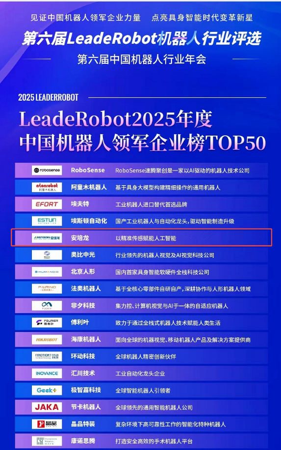 雙獎加冕!安培龍于第六屆中國機器人行業年會榮獲“機器人傳感融合創新獎”同時入選“中國機器人領軍企業TOP50榜單”