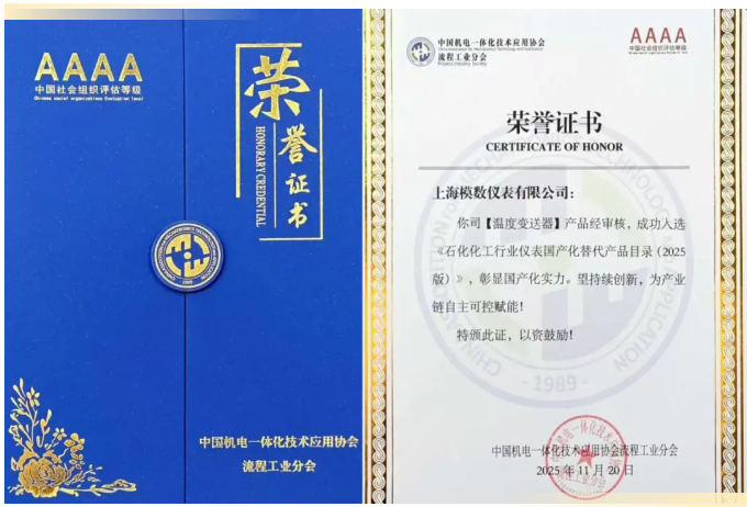 本次大會的重要亮點之一——《石化化工行業(yè)儀表國產(chǎn)化替代產(chǎn)品目錄(2025 版)》揭幕儀式備受矚目。中國機電一體化技術應用協(xié)會榮譽會長李亞平、常務副會長王繼宏等行業(yè)領導共同為目錄揭幕,為國產(chǎn)儀表的市場推廣與應用落地提供了重要指引。在隨后的頒獎環(huán)節(jié),上海模數(shù)迎來高光時刻:經(jīng)過大會評審團從產(chǎn)品性能穩(wěn)定性、技術創(chuàng)新性、市場應用價值、國產(chǎn)化率等多維度的嚴格考核,公司溫度變送器系列產(chǎn)品成功入選該目錄,這標志著上海模數(shù)的產(chǎn)品質(zhì)量與技術實力獲得了行業(yè)權威認可,也為企業(yè)在國產(chǎn)化替代浪潮中搶占先機奠定了堅實基礎。