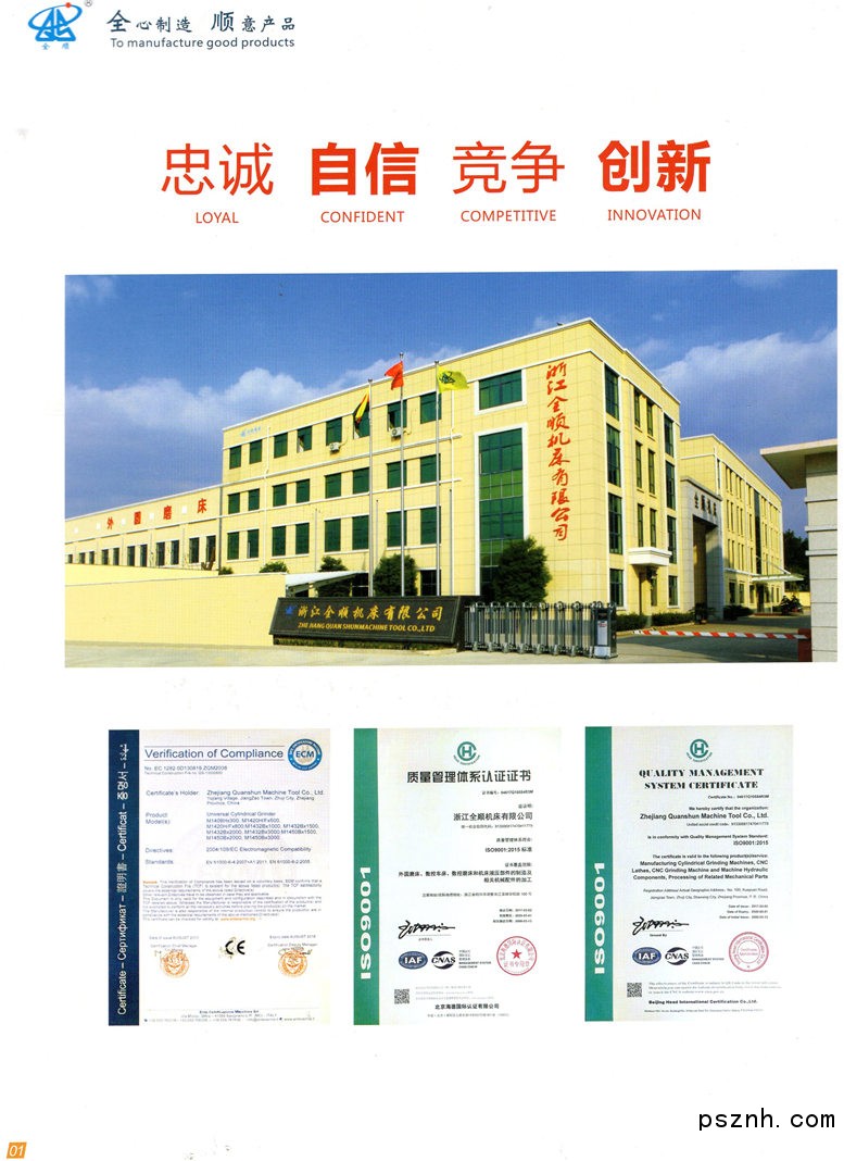 浙江全順機床有限公司是生產、銷售萬能外圓磨床的專業企業,擁有四十余年的歷史,,并生產、銷售各類平面磨床、外圓磨床的操縱箱和液壓筒等液壓元件,開發的“新型耐磨機床液壓筒”已得到大力推廣,并獲得浙江省金橋工程優秀項目獎,同全國著名的磨床公司有穩定的配套協作關系。公司主要生產M1420H×500、M1420H×800、M1320H×500、M1320H×800、M1432B×1000、M1432B×1500、M1332B×1000、M1332B×1500、M1408×300、M1308×300等磨床,所用鑄件全部來自合資公司(浙江杭機鑄造有限公司)。秉持“質量第一、信譽第一、服務第一、”的信念和較高的性價比,產品的市場占有率逐年穩定上升。公司擁有強大的設計隊伍,可根據客戶的特殊要求,設計制造各類外圓磨床。公司以“為客戶提供滿意的產品和服務”作為宗旨,熱忱歡迎國內外客商前來洽談和合作