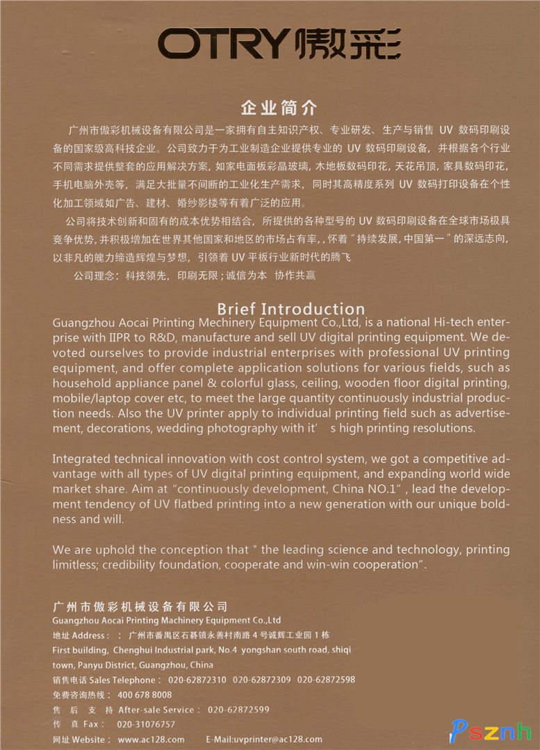 廣州市傲彩機械設備有限公司專業生產UV平板打印機,價格合理,品質有保障,售后體系健全。主要產品有:萬能打印機,UV打印機,平板打印機,萬能平板打印機,UV平板打印機,UV噴繪機,玻璃印花機,瓷磚印花機等。