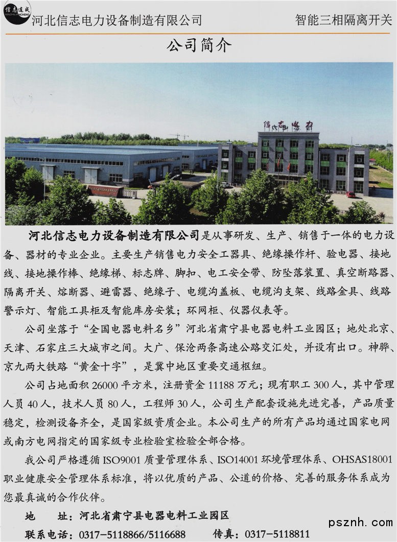 公司坐落于國家命名的“全國電器電料名鄉(xiāng)”河北肅寧電器電料工業(yè)園區(qū);地處北京、天津、石家莊三大城市之間。大廣、保滄兩條高速公路在公司北一公里處交匯,并設(shè)有出口。神驊、京九兩大鐵路在本公司10公里處交叉過境。被譽(yù)為“黃金十字”,是冀中地區(qū)重要交通樞紐。 公司占地面積26000平方米,注冊資金3108萬元;現(xiàn)有職工125人,其中管理人員12人,技術(shù)人員18人,工程師8人,公司生產(chǎn)配套設(shè)施先進(jìn)完善,產(chǎn)品質(zhì)量穩(wěn)定,檢測設(shè)備齊全,是資質(zhì)企業(yè)。本公司生產(chǎn)的高壓熔斷器、隔離開關(guān)、避雷器等產(chǎn)品通過西安高壓電器研究院有限責(zé)任公司檢測全部合格,絕緣子通過(北京)電力工業(yè)電力設(shè)備及儀表質(zhì)量檢驗(yàn)測試中心檢測全部合格,安全工器具通過蘇州電器科學(xué)學(xué)研究院股份有限公司、電力工業(yè)電力安全工器具質(zhì)量監(jiān)督檢驗(yàn)測試中心檢驗(yàn)全部合格。