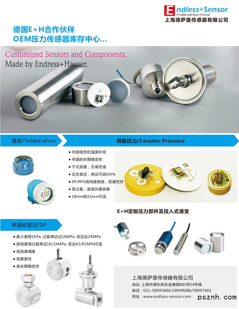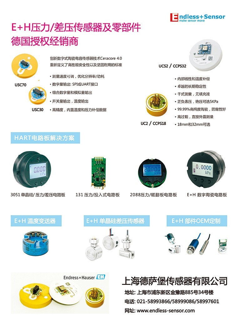 上海德薩堡傳感器有限公司位于上海浦東新區金橋出口加工區,是一家中德合作的高新技術企業。與擁有儀器儀表世界領先水平的德國Endress+Hauser公司建立戰略性OEM合作伙伴。提供Endress+Hauser公司制造最新的定制壓力傳感器和部件,滿足用戶的實際應用和產品高品質解決方案。使Endress+Hauser公司OEM產品能夠為客戶帶來利益。