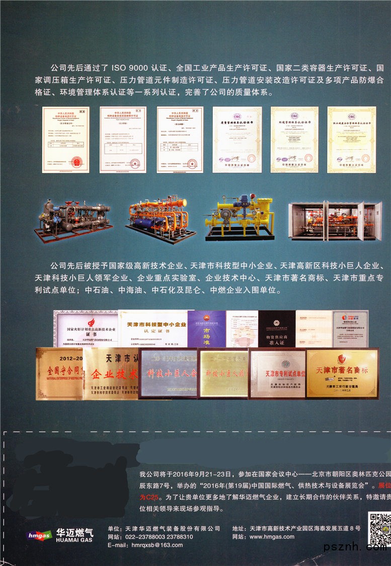 天津華邁燃氣裝備股份有限公司(天津市華邁燃氣技術發展有限公司)于2000年11月17日在天津市新技術產業園區成立,注冊資金4800萬元;是一家以研發、生產燃氣及其它能源、環保裝備為主的高科技企業。經過幾年的努力華邁公司已經在液化氣氣化、多氣源摻混、CNG減壓裝置及LNG氣化站、燃氣調壓箱(站)及電站脫硝(氨站)等領域居于國內領先水平。