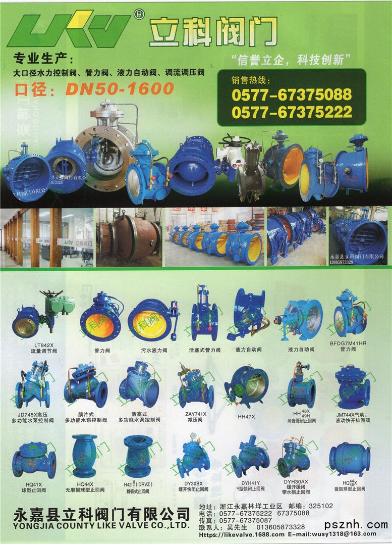 永嘉縣立科閥門有限公司是一家專業從事閥門設計,開發, 制造, 銷售為一體的股份制造合作企業,坐落在永嘉縣甌北鎮馬岙工業區,是一家專業生產各種;閘閥,截止閥,止回閥,球閥,蝶閥,管力閥,液力自動閥,鍛鋼閥,不銹鋼閥,BFDZ701X液力自動控制閥,BFDG7M41HR管力閥,H42T靜音止回閥,HH48X微阻緩閉止回閥,HQ44X球型止回閥,YX741X可調式減壓穩壓閥,ZAX742X安全泄壓閥,ZJ145X電動遙控閥,F745X水力(遙控)浮球閥,JD745X多功能水泵控制閥,DY30AX緩開緩閉多功能止回閥,DY30BX緩開快閉多功能止回閥,JD745X高壓多功能水泵控制閥,HH47X消聲微阻緩閉止回閥,JM744X膜片式液壓,氣動角式快開排泥閥,100X遙控浮球閥,200X減壓閥,300X緩閉止回閥,400X流量控制閥,500X泄壓持壓閥,600X水力控制閥,700X水泵控制閥,800X壓差旁通平衡閥,900X緊急關閉閥等。公司設有生產部,技術部,品管部,銷售部,財務部等部門。是一家科研,開發,生產,銷售,服務與一體的現代化企業。不斷采用新技術,新工藝,新材料,積極開發新產品,為建設現代化閥門企業而努力奮斗。經過不不惜努力,公司產品銷售覆蓋大江南北,深得廣大用戶信賴與和評。公司堅持貫徹質量第一,服務周到為經營目的,可以可靠性,可用性為目標創建一流名牌,以優惠的價格,良好的售后服務為廣大新老用戶服務。