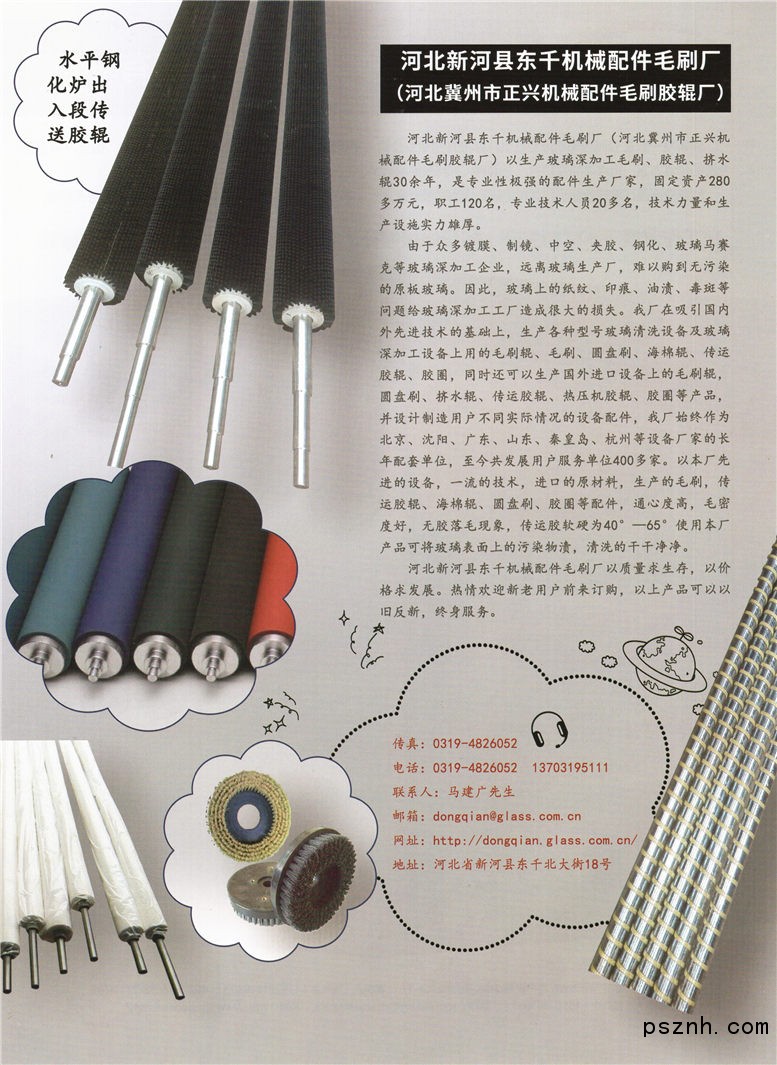 冀州市正興機械配件毛刷膠輥廠已生產玻璃深加工毛刷膠輥、擠水輥30余年,是專業性極強的配件生產廠家,固定資產280多萬元,職工120名,專業技術人員20多名,技術力量和生產設施實力雄厚。由于眾多鍍膜、制鏡、中空、夾膠、鋼化、玻璃馬賽克等玻璃深加工企業,遠離玻璃生產廠,難以購到無污染的原板玻璃。因此,玻璃上的紙紋、印痕、油漬、毒斑等問題給玻璃深加工工廠造成很大的損失。我廠在吸引國內外先進技術的基礎上,生產各種型號玻璃清洗設備及玻璃深加工設備上用的毛刷輥、毛刷、圓盤刷、海棉輥、傳運膠輥、膠圈,同時還可以生產國外進口設備上的毛刷輥,圓盤刷、擠水輥、傳運膠輥、熱壓機膠輥、膠圈等產品,并設計制造用戶不同實際情況的設備配件,我廠始終作為北京、沈陽、廣東、山東、秦皇島、杭州等設備廠家的長年配套單位,至今共發展用戶服務單位400多家。以本廠先進的設備,一流的技術,進口的原材料,生產的毛刷,傳運膠輥、海棉輥、圓盤刷、膠圈等配件,通心度高,毛密度好,無膠落毛現象,傳運膠軟硬為40°—65°使用本廠產品可將玻璃表面上的污染物漬,清洗的干干凈凈。