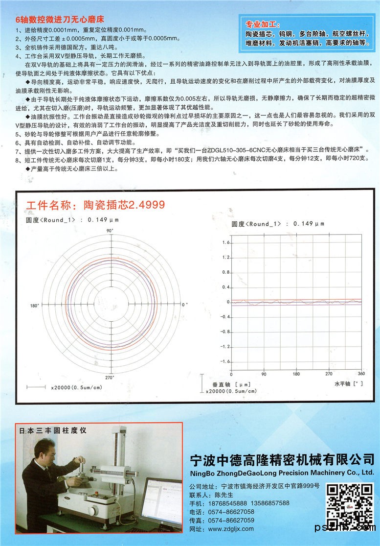 主要產品有高精度無心磨床、高精度動靜壓無心磨床、納米級高精度數控微進刀無心磨床。同時可根據客戶產品需要,研發制造非標自動化磨床,達到自動上料、自動研磨、自動收料、自動檢測、自動補償、自動調節,實現全自動化的目的。減少對技術人員的依賴,公司產品廣泛用于汽車、各種馬達、電機、轉軸、摩托車配件、汽車配件、家電、模具、刀具、五金、鎢鋼、傳真復印機、軸承、陶瓷插芯光纖通訊、國營軍工、航空、航海等精密制造行業。我公司生產的納米級數控微進刀無心磨床,目前在國內是頂尖的,陶瓷插芯我們能做到0.0002mm的真圓度,進刀0.0001mm進給量,外徑工差0.0005以內的精度,目前國內的磨床沒有一家能做到,就連國外的磨床也很難達到。