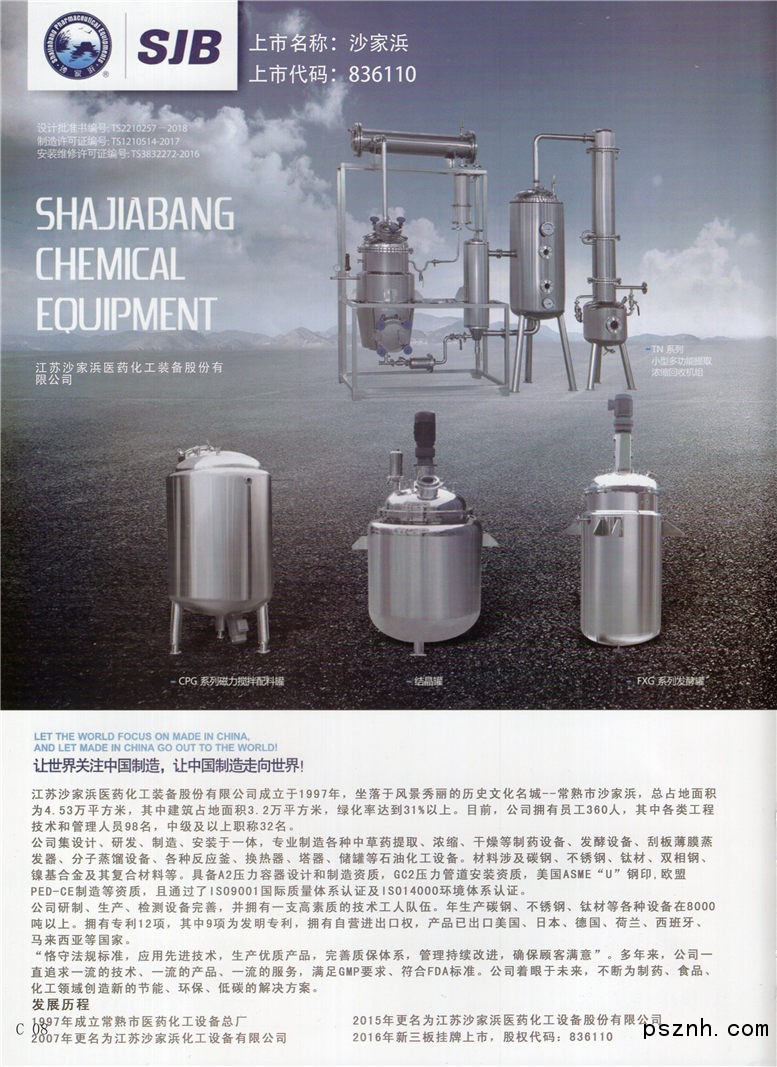 江蘇沙家浜醫藥化工設備有限公司(常熟醫藥化工設備總廠,沙家浜藥機)成立于1978,位于沙家浜常熟市,這是一個美麗的歷史文化名城。是一家從事石油化工、生物工程、真空制鹽、化纖、制藥、食品等行業的設計、開發、制造、安裝的民營科技企業。產品已出口到美國、日本、德國、荷蘭和西班牙。,馬來西亞和其他國家。
