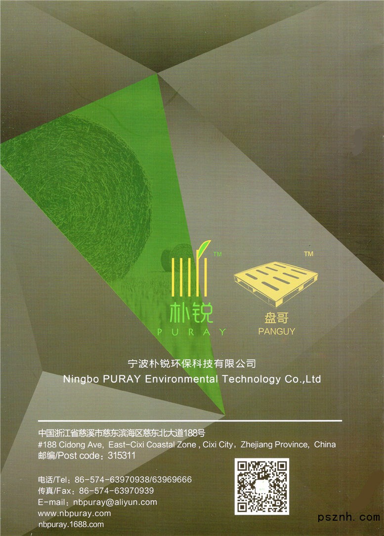 寧波樸銳環保科技有限公司是國內首家獨資創立的高科技綠色環保企業,位于長江三角洲的核心城市—寧波,占地面積1.9萬平方米。公司以國內幾大知名農業大學為技術依托,一直致力于再生資源循環利用應用領域的研究,在環保托盤研發設計及生產線革新方面取得了卓越成就。