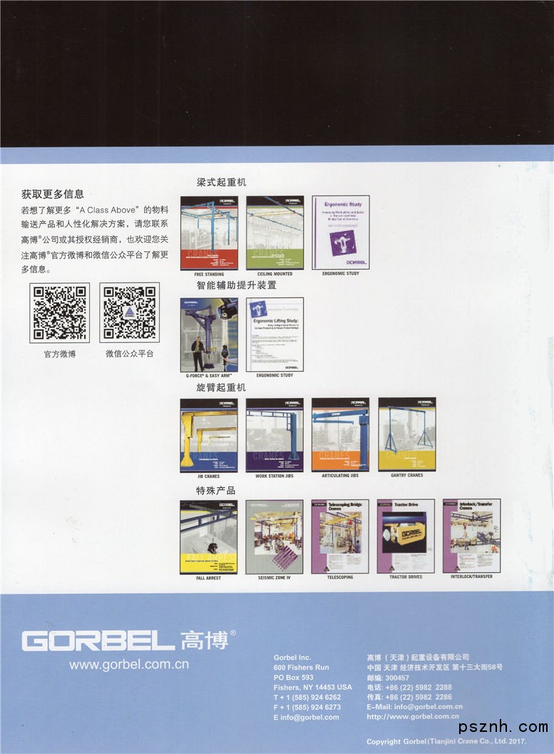 GORBEL高博可以提供多種高架物料輸送方案,其組合式起重機系列包括:組合式自立起重機、組合式懸掛起重機、單軌起重機和組合式旋臂起重機(立柱式/壁掛式)。我們還生產更為靈活精準的智能型提升裝置G-Force™、Easy Arm™。同時,GORBEL高博也是高性能手動和電動工字鋼旋臂起重機的主要生產商。2013-2014年間,高博持續創新,不斷完善生產線,又推出了鋁制主梁組合式起重機和G/GR系列環鏈電動葫蘆等產品。