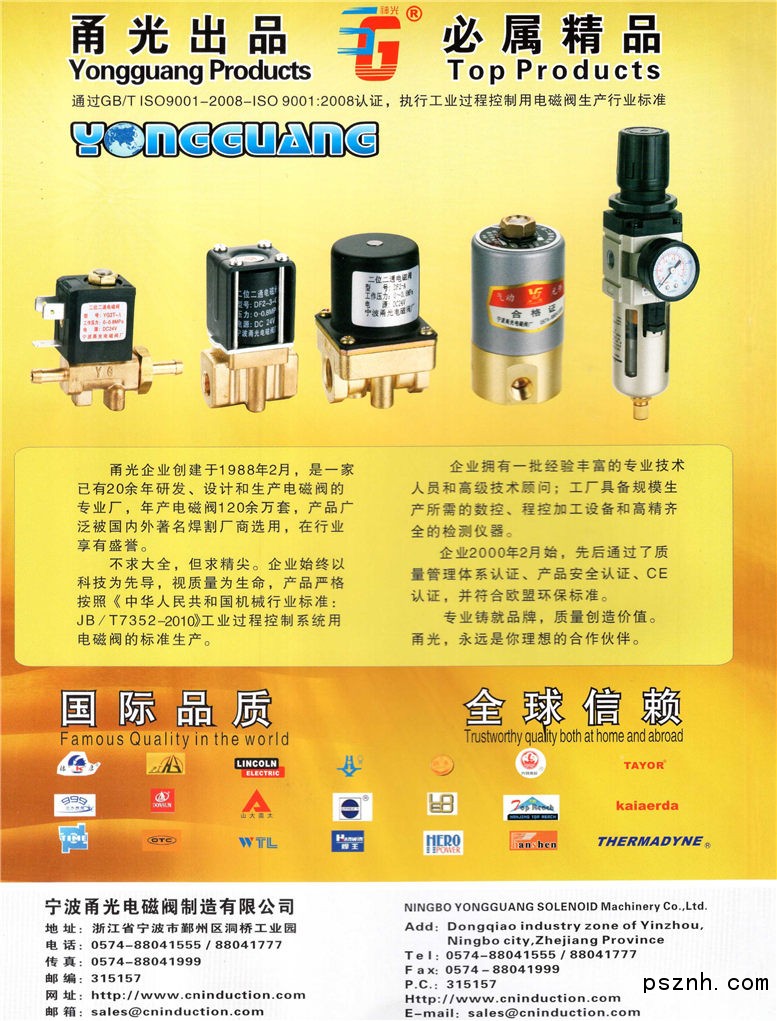 寧波甬光電磁閥制造有限公司創(chuàng)建于1988年2月,是一家已有20余年研發(fā)、設(shè)計(jì)和生產(chǎn)電磁閥的專業(yè)廠,是中國(guó)電器工業(yè)協(xié)會(huì)電焊機(jī)分會(huì)會(huì)員單位。企業(yè)占地6000余平方米,廠房面積7500平方米,年產(chǎn)電磁閥100萬套以上。產(chǎn)品廣泛應(yīng)用于焊接與切割、食品、化工、輕紡等機(jī)械行業(yè),在國(guó)內(nèi)外高端用戶中享有盛譽(yù)。