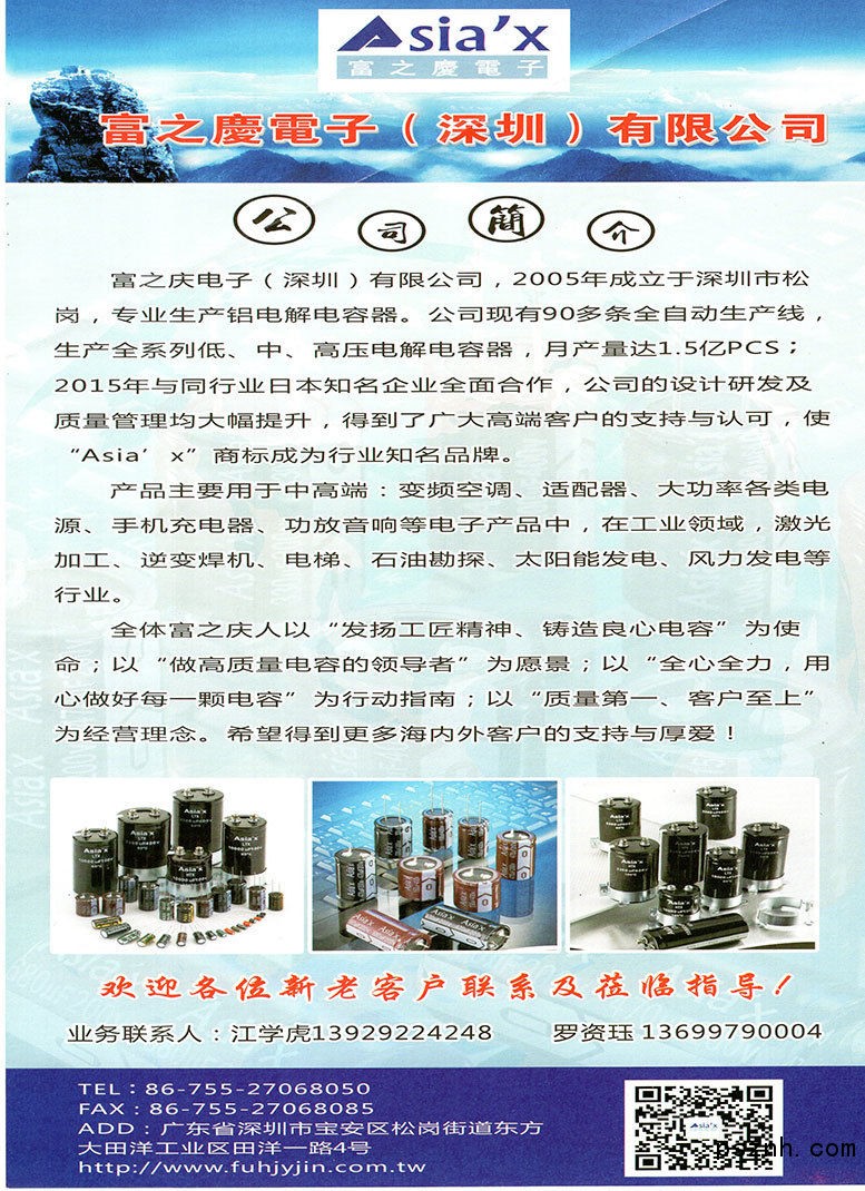 富之慶電子(深圳)有限公司,于2005年成立于深圳松崗,專業生產電解電容器,目前除