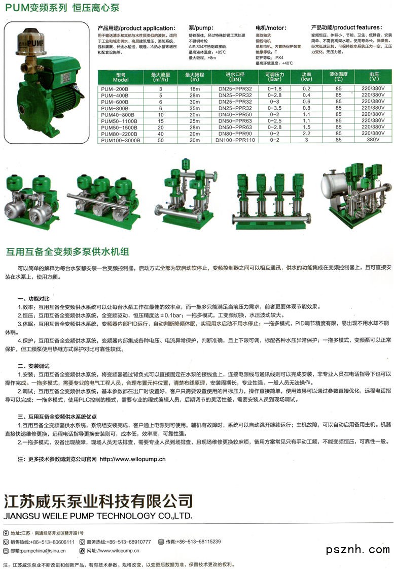 江蘇威樂泵業(yè)科技有限公司一直致力于蘇電智能變頻恒壓供水系統(tǒng)的開發(fā)生產與銷售,經過蘇電公司技術人員進十幾年的開發(fā), 成功的開發(fā)出智能變頻恒壓控制器和水泵完美的一體機組合,組合成完美的恒壓供水系統(tǒng)。使用先進的IC技術,強大靈活的人 性化設計,成功推出了成熟可靠的變頻恒壓系統(tǒng)產品,控制技術已經久經考驗,組合方式完美,簡單易操作的面板, 壓力直接顯示 在控制器上面,使用戶在調試水泵時不需要專業(yè)的技術人員來指導,公司一直以來堅持以(全自動科學供水,節(jié)能環(huán)保,簡單的安裝 調試,平民化的價格)為中國的供水事業(yè)努力,本著薄利經營的服務方針,建立長期的業(yè)務合作關系為基礎,為客戶提供最滿意的 優(yōu)質產品和長期信賴的技術售后服務,蘇電變頻系列。真真的泵浦變頻專家,更多的恒壓供水系統(tǒng)方案盡請垂詢。