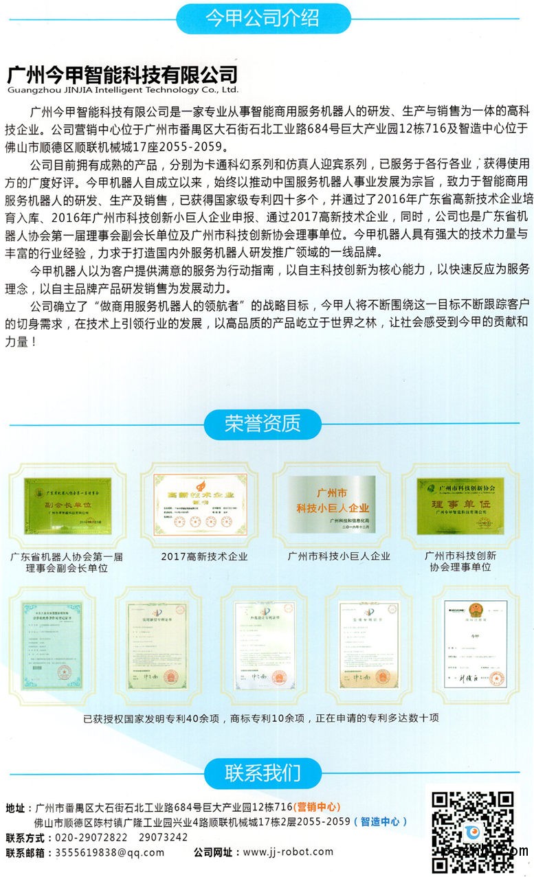 廣州今甲智能科技有限公司是一家專業從事智能商用服務機器人的研發、生產與銷售為一體的高科技企業。公司營銷中心位于廣州市番禺區大石街石北工業路684號巨大產業園12棟716室及智造中心位于佛山市順德區順聯機械城17座2055-2059室。公司目前擁有成熟的產品,分別為卡通科幻系列和仿真人迎賓系列,已服務于各行各業,獲得使用方的廣度好評。今甲機器人自成立以來,始終以推動中國服務機器人事業發展為宗旨,致力于智能商用服務機器人的研發、生產及銷售,已獲得國家級專利四十多個,并通過了2016年廣東省高新技術企業培育入庫、2016年廣州市科技創新小巨人企業申報、通過2017高新技術企業,同時,公司也是廣東省機器人協會第一屆理事會副會長單位及廣州市科技創新協會理事單位。今甲機器人具有強大的技術力量與豐富的行業經驗,力求于打造國內外服務機器人研發推廣領域的一線品牌。