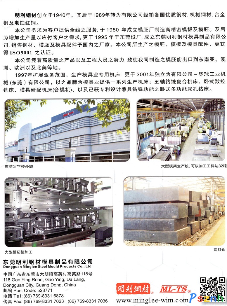 本公司務求為客戶提供全線之服務,于1980年成立模胚廠制造高精密模板及模胚.及后為增加生產量以應付客戶之需求,更于1995年于東莞設廠,成立東莞明利鋼材模具制品有限公司,銷售鋼材、模胚及模具配件予國內之廠家。本公司所生產之模胚、模板及模具配件,更獲得ISO9001之認證。本公司憑著高質量之產品以及工程人員之努力,致使我司制造之模胚能出口到東南亞、澳洲、歐洲以及北美等地。