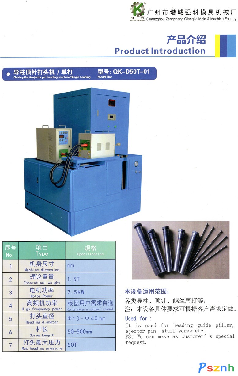 廣州市增城強科模具機械廠,本廠有數臺(100克-1300克)的注塑機、數臺(10KG以下)的吹塑機、代客加工各種塑膠件,數臺(全自動頂針打頭機)專業為廣大新老客戶加工各種:導柱、導套、頂針、螺絲、模具配件以及各種金屬熱壓成型等,并代客設計、研發各種塑膠模具、自動化機械。歡迎來圖來樣加工。 強科模具機械廠創建于2006年,是一家專業設計、制造:《塑膠模具、自動化機械》的廠家已有6年的開發設計、生產制造的豐富經驗。多年來我們的不懈努力和引進國內外先進技術作為參考,吸收其中的技術,使本廠的技術精益求精,產品質量、技術質量更是不斷提高,暢銷全國各地,遠銷東南亞。 由于業務的蓬勃發展與我們銳意進取這種精神的發揮,和科學管理,是我們的發展精神。