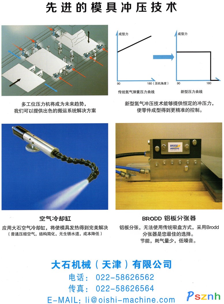 大石機械(天津)有限公司是日本大石機械株式會社在中國的全資子公司。公司成立于2004年7月,并于2007年在廣州、上海成立分公司。我公司是美國HYSON氮氣彈簧在中國的總代理,并提供工程設計及售后服務。同時,還代理美國PHD氣動夾鉗、美國LSP噴涂系統、法國PRONIC模內攻絲機等。歡迎各界同仁與我公司聯系。