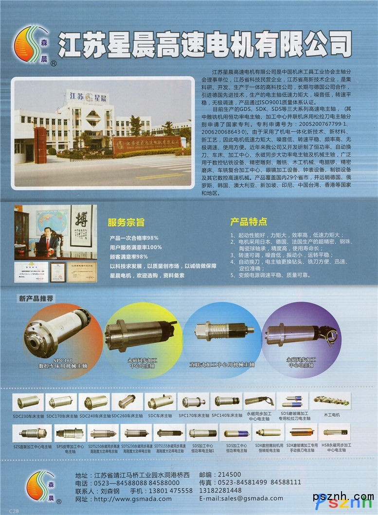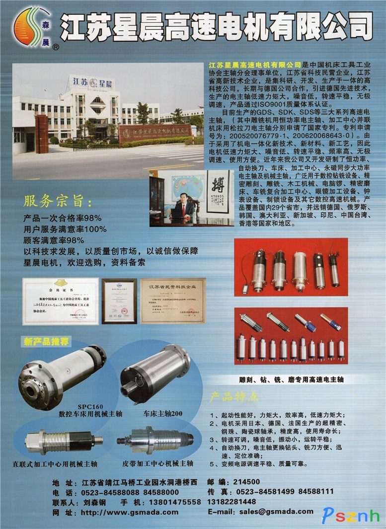 江蘇星晨高速電機有限公司是中國機床工具工業協會主軸分會理事單位,江蘇省科技民營企業,江蘇省高新技術企業,江蘇省百家優秀科技成長型企業,國內電主軸行業標準起草單位之一,是集研發、設計、生產于一體的高科技公司。