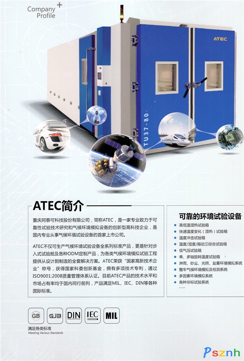 主要產(chǎn)品:溫度、濕度、低氣壓、熱真空、鹽霧、陽光、沙塵、防爆、淋雨、綜合試驗(yàn)箱、旋轉(zhuǎn)試驗(yàn)箱。各種非標(biāo)準(zhǔn)試驗(yàn)系統(tǒng)、汽車尾氣排放檢測系統(tǒng)、老化與監(jiān)測試驗(yàn)系統(tǒng)、衛(wèi)星環(huán)境模擬系統(tǒng)等。ATEC產(chǎn)品已廣泛應(yīng)用于各種高端國家重點(diǎn)實(shí)驗(yàn)室和各領(lǐng)域?qū)嶒?yàn)室,涉及航空、航天、兵器、船舶、電子、郵電、鐵道、電力、汽車、計(jì)量、醫(yī)院等諸多領(lǐng)域。