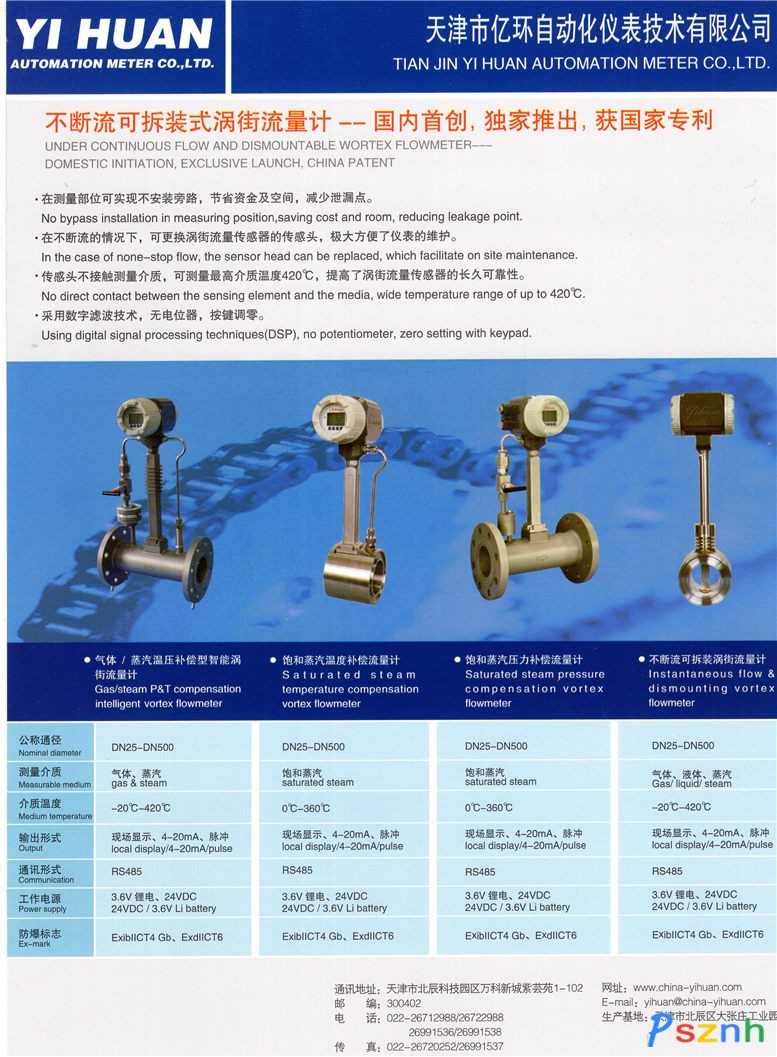 天津億環(huán)儀表公司從業(yè)20年來一直致力于流量計的開發(fā)和生產(chǎn),其中自主研發(fā)的不斷流可拆卸式渦街流量計,已獲國家專利,是目前國內(nèi)唯一一款可測最高介質(zhì)溫度達(dá)到420℃的渦街流量計。