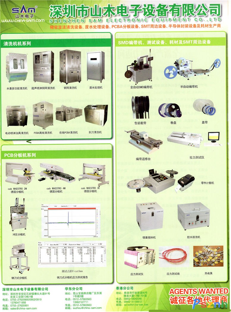 深圳市山木電子設備有限公司專業從事精密濕法清洗設備(鋼網清洗機,絲網清洗機,旋轉噴淋治具清洗機,PCB /PCBA清洗機)、分板機、SMT周邊設備(零件計數器,錫膏攪拌機)及半導體編帶設備和耗材的生產、銷售、服務。公司創立于2005年,是一家致力于電子產品制造業科技企業,有雄厚的技術實力、卓越的服務贏得了廣大業界的信賴和支持。公司在深圳,蘇州均有注冊。山木電子先后取得多家國內外知名廠家設備的銷售代理資格,銷售網絡及服務團隊均以倍增的速度發展。應國內市場的需求,公司相繼在華東、華北、華西等地區設立辦事處。