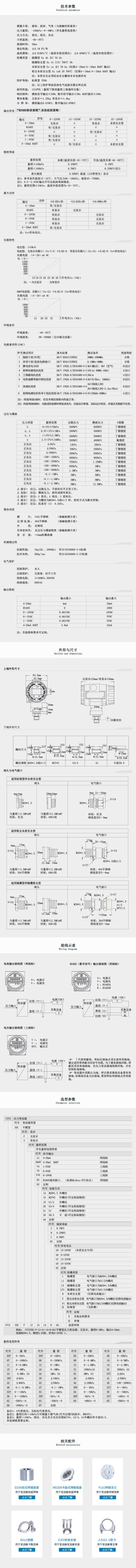 壓力變送器CYYZ55C系列可以根據(jù)型號(hào)的不同進(jìn)行表 壓、絕壓的測(cè)量。適用于液體或氣體和流程工業(yè)的壓力 測(cè)量。其具有多種防爆功能選 擇,本質(zhì)安全型、粉塵本質(zhì)安全型、隔爆型、隔爆粉塵型,并且還可 選擇HART協(xié)議通訊,性價(jià)比高。 它還具有輸出信號(hào)、量程范圍、壓力接口多等多元化的優(yōu)勢(shì), 方便匹配不同工況現(xiàn)場(chǎng)。